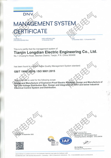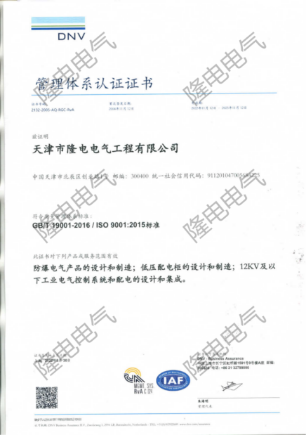 隆電電氣公司順利完成由挪威船級(jí)社(DNV)進(jìn)行的ISO9001質(zhì)量管理體系