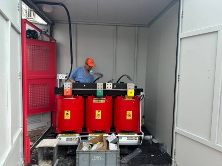 25-06-01/LD-C-272合同貨物~隆電電氣公司為中海油天津場(chǎng)地建造的大型箱式變電站已完成設(shè)計(jì)、生產(chǎn)、制造、檢驗(yàn)。該設(shè)備尺寸為L(zhǎng)*W*H=7000×3500×2820mm,由1臺(tái)SCB18-1600KVA變壓器和1臺(tái)SCB18-1250KVA變壓器及配套低壓柜構(gòu)成。今天完成最終測(cè)試,發(fā)往中海油天津現(xiàn)場(chǎng)。