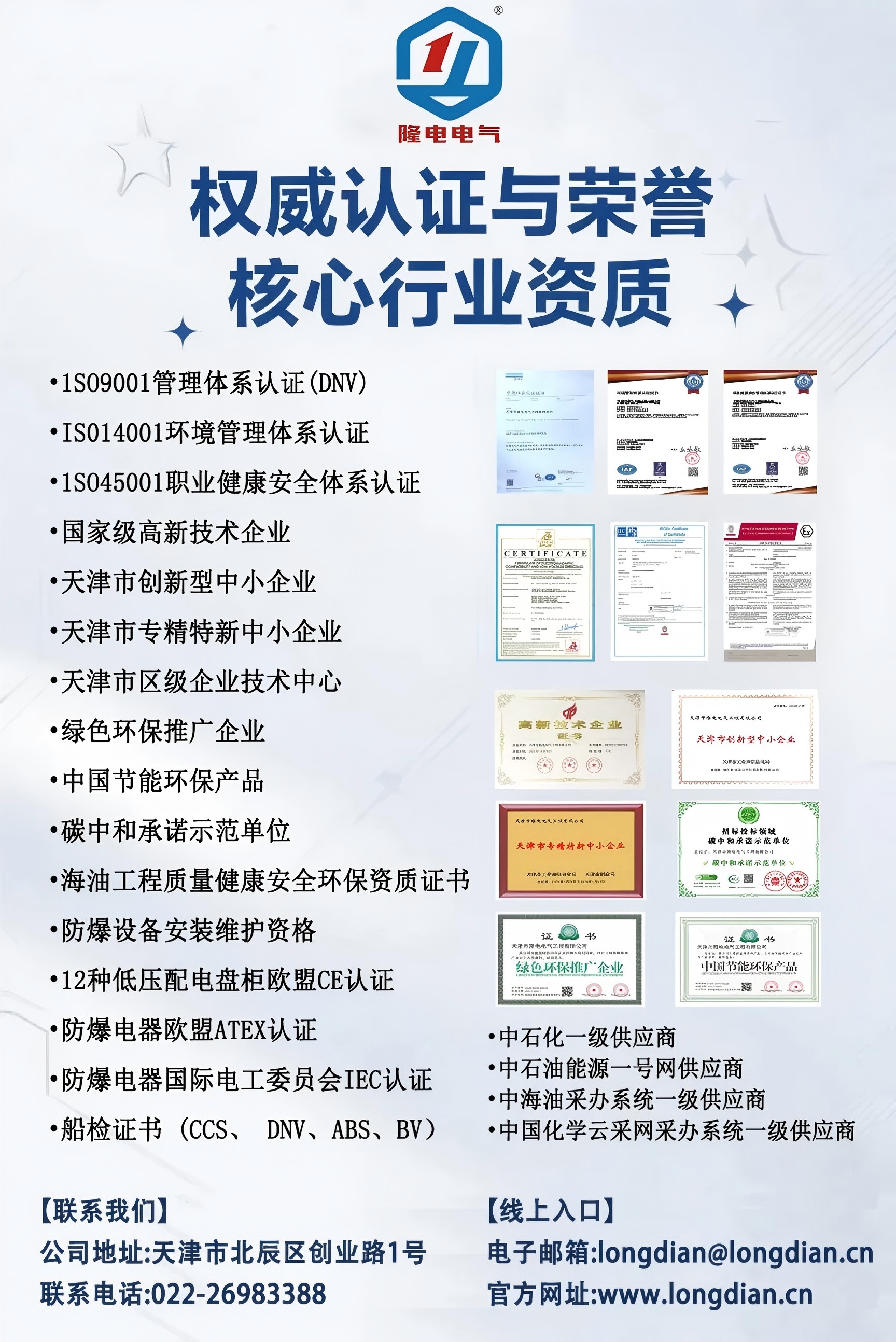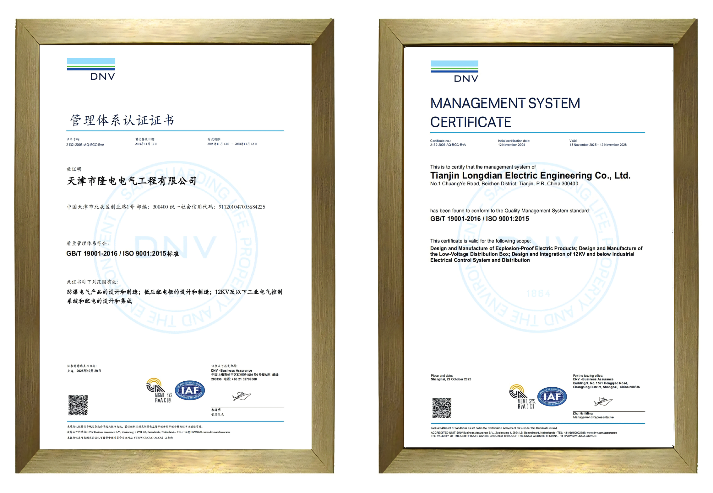 天津市隆電電氣工程有限公司GB/T 19001-2016/ISO 9001:2015質(zhì)量管理體系順利通過挪威船級(jí)社(DNV)三年換證審核,2025年10月29日收到DNV簽發(fā)證書。證書覆蓋范圍包括:防爆電氣產(chǎn)品、高低壓配電柜、工業(yè)電氣控制系統(tǒng)的設(shè)計(jì)、生產(chǎn)、制造。