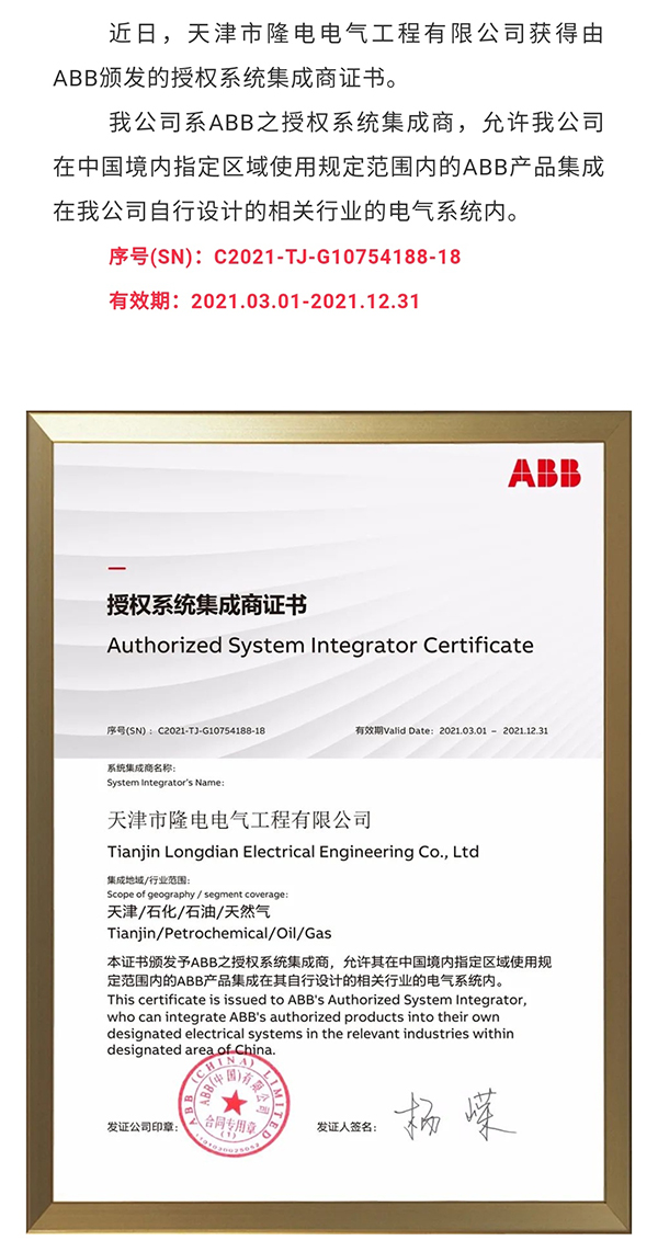 隆電電氣成為ABB授權(quán)系統(tǒng)集成商